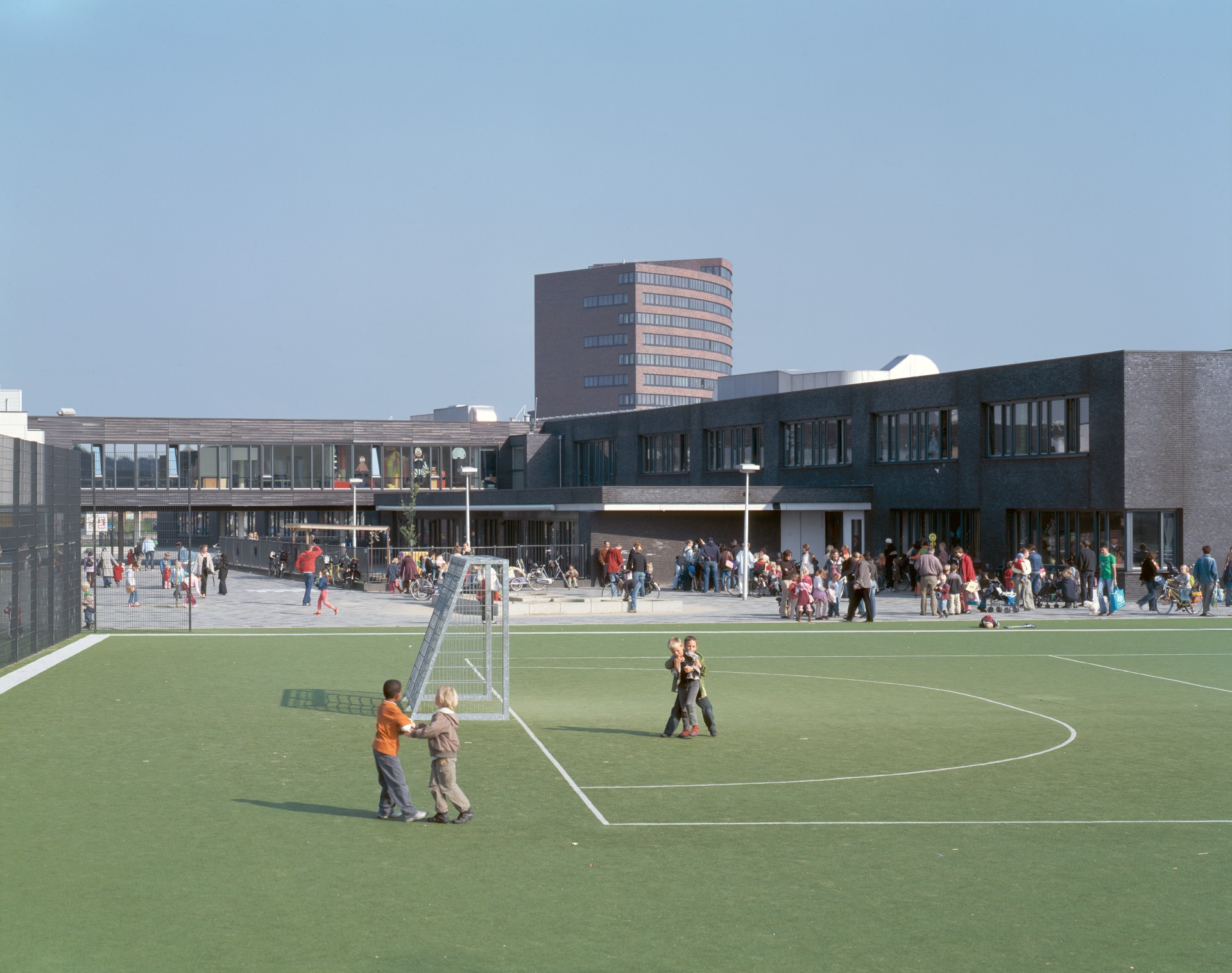 De opdracht was het realiseren van een forumschool met als componenten: twee zestienklassige scholen, kinderdagverblijf, sportzalen, vrijetijdscentrum, jeugd- en jongerenwerk en speeltuingebouw. Dit project is gestart in 1998 en heeft in dat jaar ook de vernieuwingsprijs gekregen van het Ministerie van OC en W en het ICS vanwege de vernieuwende gedachten die er uit het programma en het ontwerp naar voren kwamen. In de aanloop naar het ontwerp en bij het doorwerken van de schetsen hebben wij veel werk gestoken in het overleggen met de verschillende partijen ten aanzien van vergaande vormen van samenwerking in het gebouw. Daar waar in het oorspronkelijk stedenbouwkundige plan vijf losse gebouwen bedacht waren rondom een centraal plein, zijn we na een aantal goede en intensieve gesprekrondes uitgekomen op het door ons voorgestelde inplug-model dat voor alle partijen een forse meerwaarde bood. Op basis van die uitgangspunten is het programma van eisen bijgesteld en aangepast en is het ontwerp verder uitgewerkt.