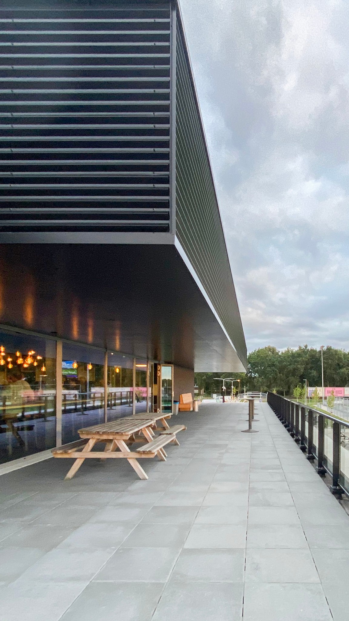 Het programma op de verdieping is kleiner dan dat van de begane grond waardoor er rondom de kantine een royaal terras kon worden gemaakt met zicht op de omringende velden. Dit terras is deels overdekt door de grote overstekken van het kantine dak. De kantine en bestuurskamers zijn uitgevoerd met grote puien en zo vormen deze samen met het terras een royale tribune naar de velden. Het terras is ook meteen vanaf de velden toegankelijk door middel van een grote tribunetrap.