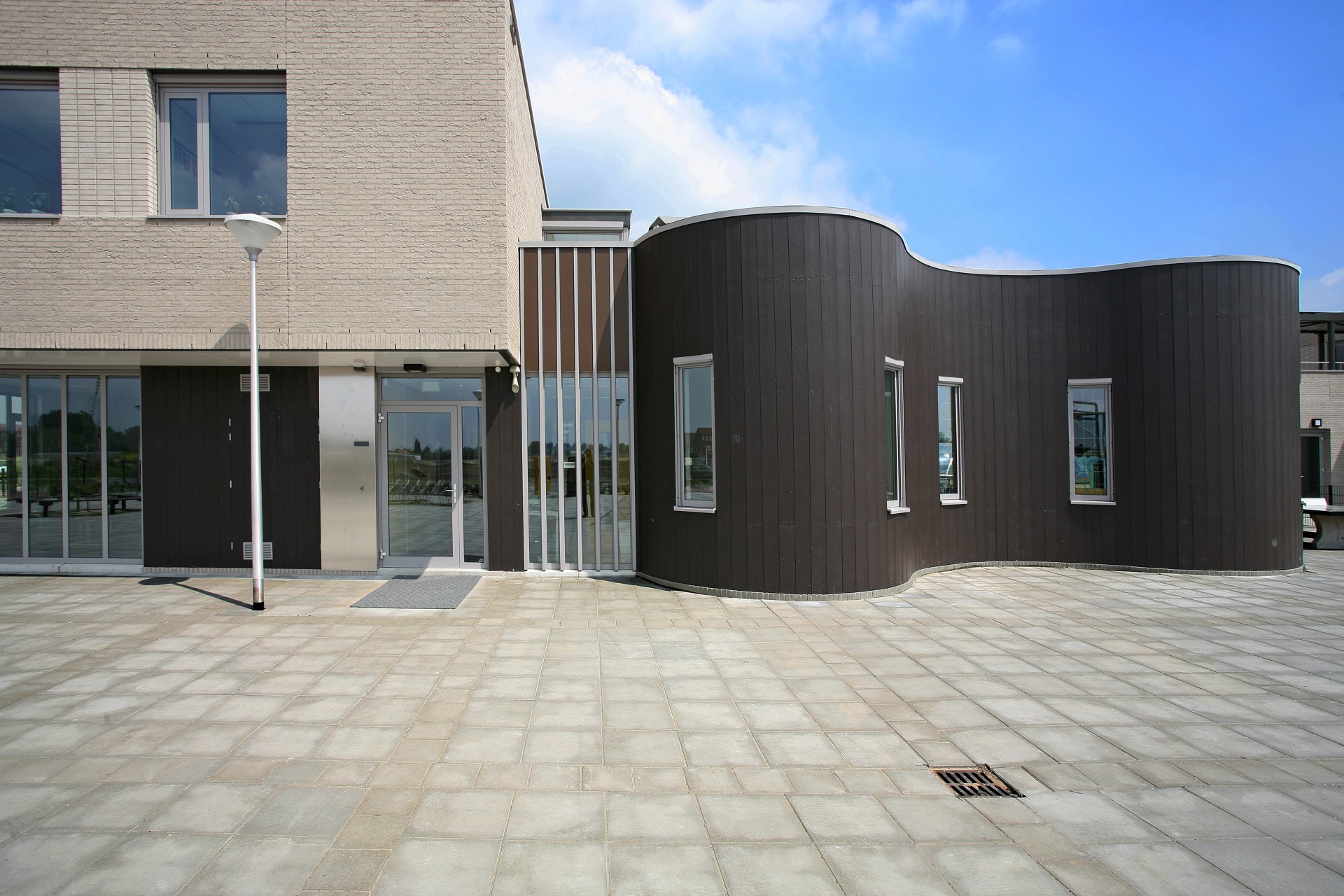 Het scholen- en welzijnscluster biedt onderdak aan vier basisscholen, elk van verschillende denominatie. Samen zullen zij 44 groepsruimtes omvatten. Daarbij is een welzijnscentrum geplaatst waarin een kinderdagverblijf (4 groepen dagopvang) een BSO-unit (2 groepen), een peuterspeelzaal (2 groepen) tienerruimte en kantoren voor de welzijnsorganisatie. Om maximale herkenbaarheid te verkrijgen zijn de verschillende units (scholen, KDV, bso etc.) als losse units vormgegeven en samen aan een verbindende gang gesitueerd. Het geheel wordt verbonden door het toepassen van één materiaal: grijze baksteen en verlevendigd door verschillende kleuren panelen en zonweringen.