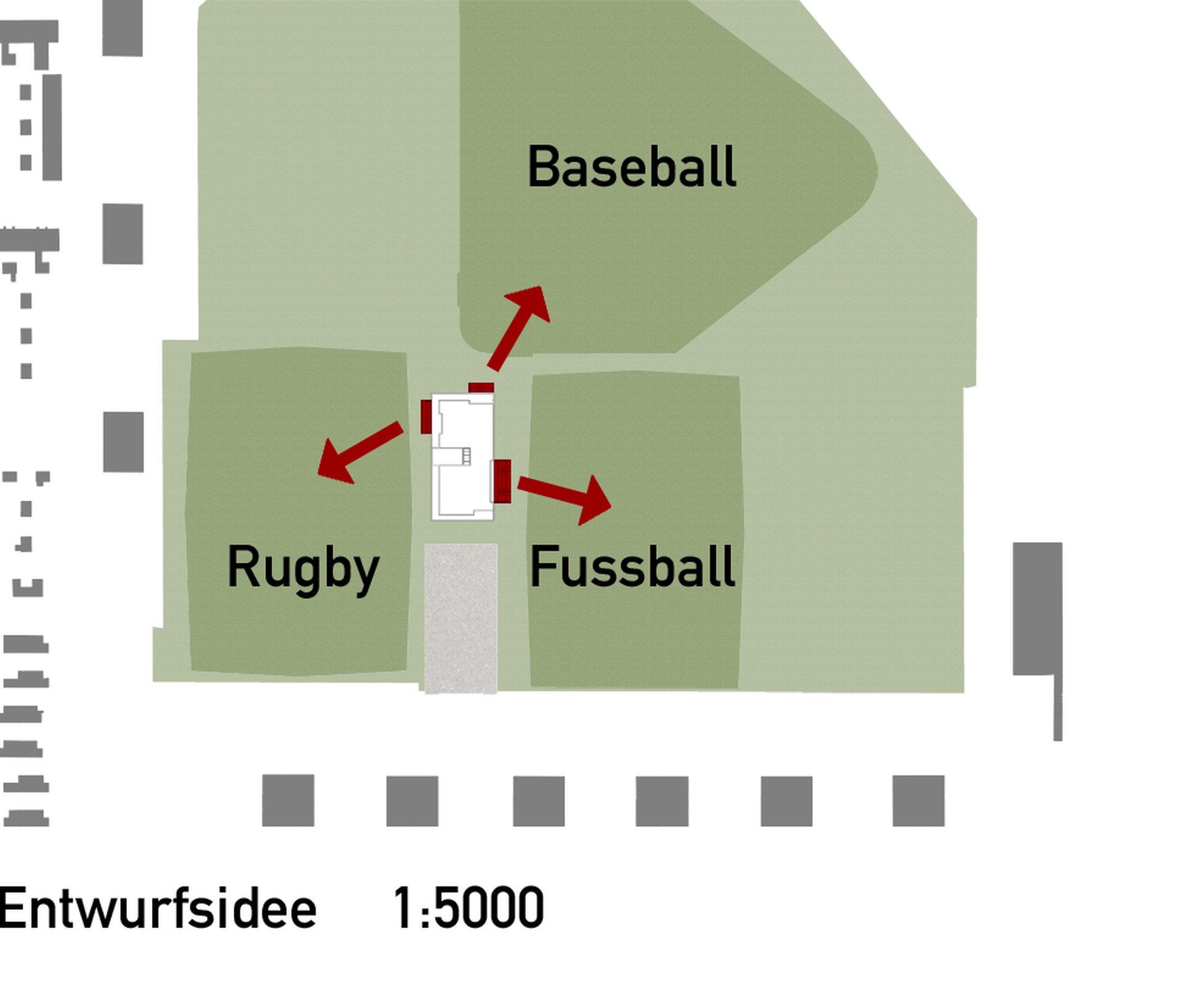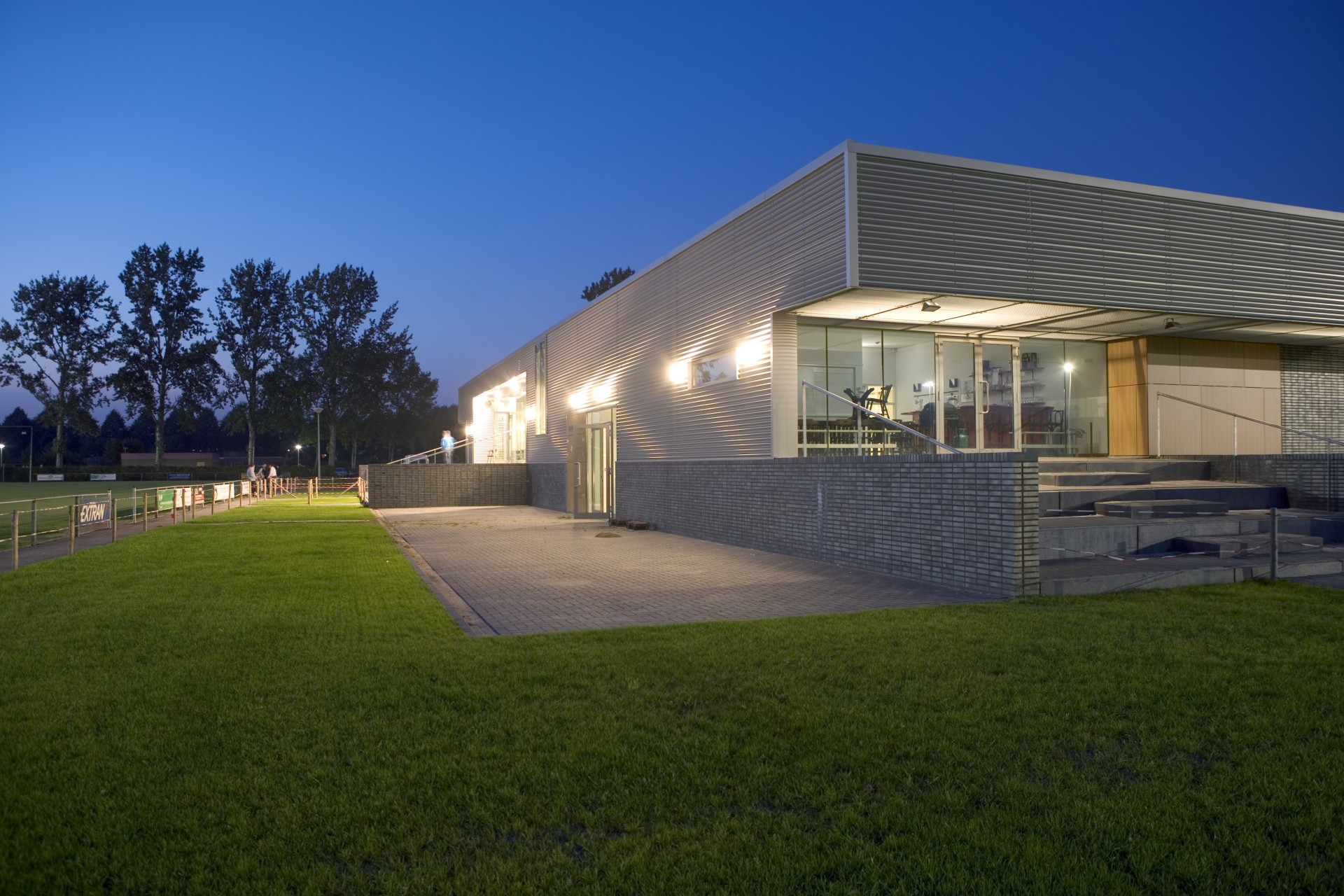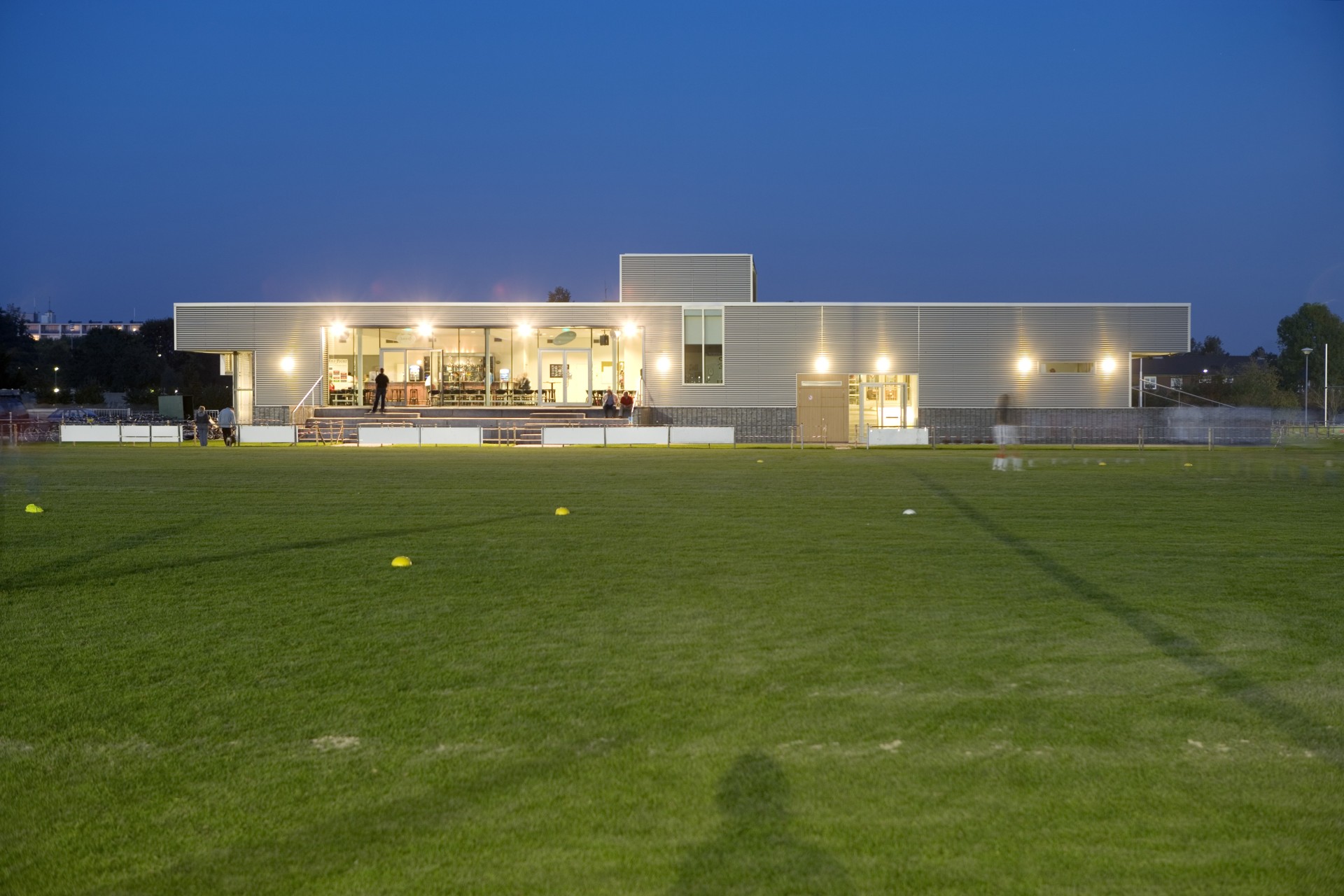 Temidden van de bestaande sportvelden in het sportpark is een nieuw verenigingsgebouw gerealiseerd dat onderdak biedt aan de sportverenigingen. In een halfverdiepte bouwlaag zijn de douche- en kleedruimtes ondergebracht alsmede de bergingen. Dit volume fungeert als een podium waar bovenop drie kantines en de bestuursruimtes zijn geplaatst. Het gebouw ligt centraal ten opzichte van de hoofdvelden van de drie hoofdgebruikers: voetbal, honkbal en rugby. Elke kantine is zo geplaatst dat zij uitzicht biedt op het bijbehorende wedstrijdveld. De samenvoeging van de oorspronkelijke drie kantines in een gebouw maakt het mogelijk flexibeler van de voorzieningen gebruik te maken. Zo staan bij grotere evenementen zoals toernooien meer kleed- en douchefaciliteiten ter beschikking van de clubs.