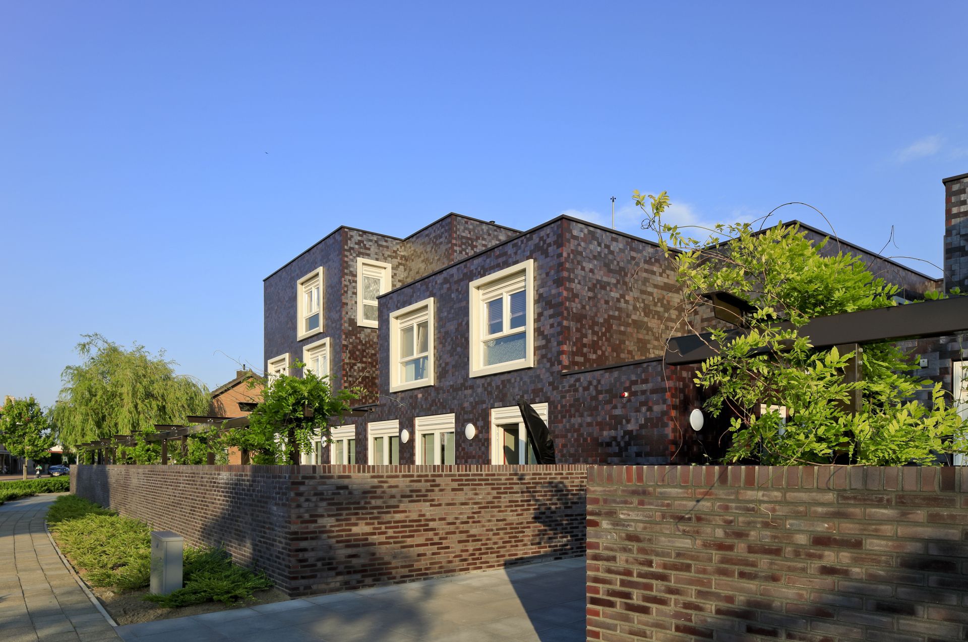 Frencken Scholl Architecten ontwierp reeds meerdere voorzieningen voor mensen met een zorgbehoefte. In Nederweert wonen de vierentwintig lichamelijk en verstandelijk gehandicapten in een kleinschalig woonbegeleidingscentrum. Het is heel bewust ingevoegd in de woonwijk. Aan de Geenestraat, waar ook de hoofdingang is, is de gevel geleed in aansluiting op de kleinschalige bebouwing in de rest van straat. Wij deelden het centrum op in kleine functionele eenheden van vier woningen: elke woning is voor zes mensen met een lichamelijke of geestelijke beperking. In elke eenheid is bovendien een ‘gezinshoofd’. In het complex zijn verder alle voorzieningen om het alledaagse leven voor de bewoners soepel te laten verlopen. Deze opzet maakt het voor de bewoners herkenbaar kleinschalig wat hun zelfvertrouwen versterkt.